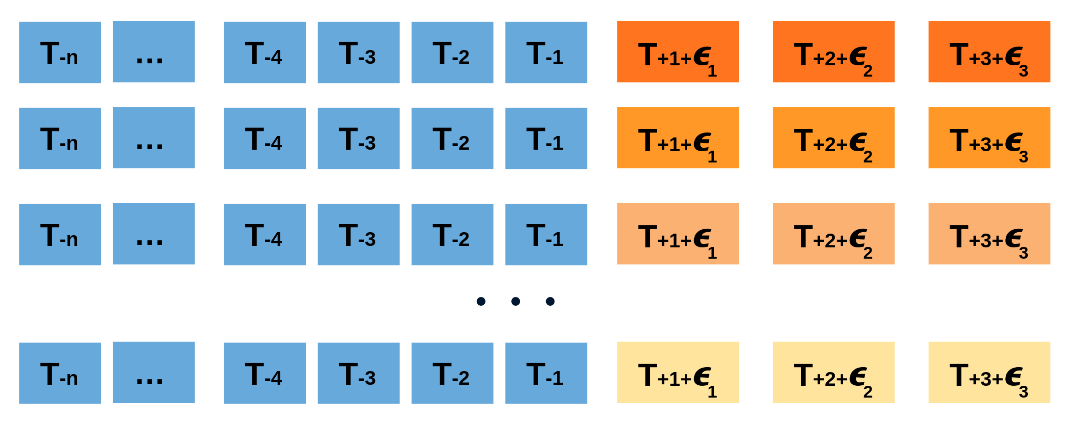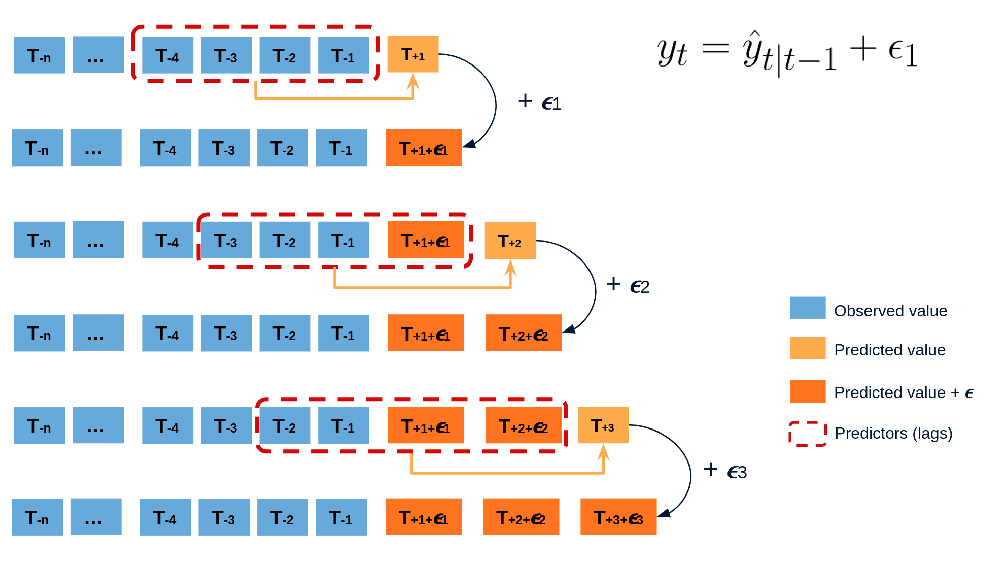 Doing this repeatedly, a collection of slightly different predictions is created (possible future paths), that represent the expected variance in the forecasting process.